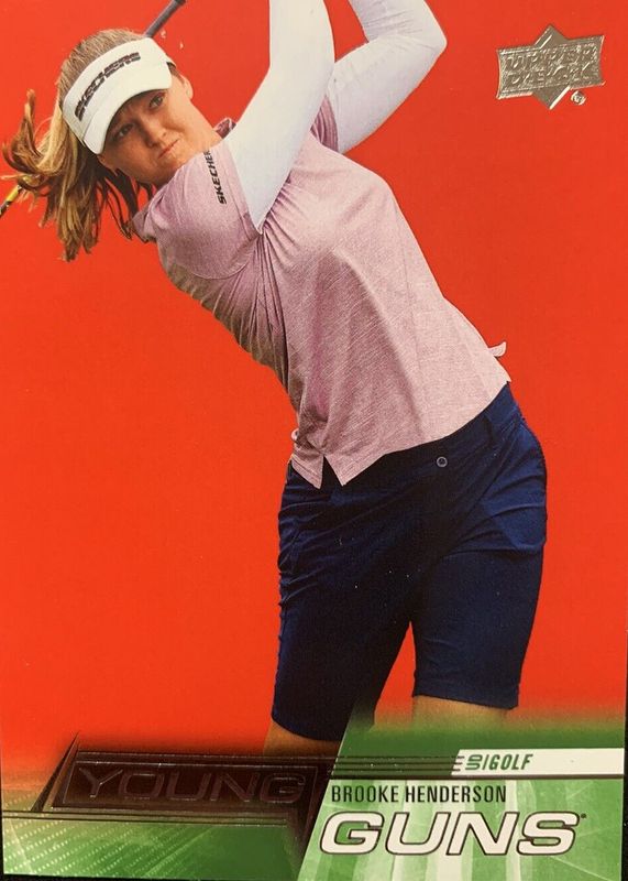 Brooke Henderson's Golf cards are available in at least 3 sets. Brooke Henderson's biggest 7-day price movers are 2024 Upper Deck #128 Young Guns, 2024 Upper Deck #CFL-14 Cleared for Launch /(SSP), and 2024 Upper Deck Portfolio #AR-HE Allure Black Rainbow Parallel Rookies.