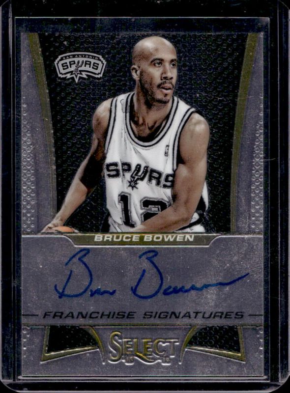 Bruce Bowen's Basketball cards are available in at least 52 sets. Bruce Bowen's biggest 7-day price movers are 2013 Select #15 Franchise Signatures, 2013 Select #15 Franchise Signatures Blue /49, and 2013 Select #15 Franchise Signatures Black /1.