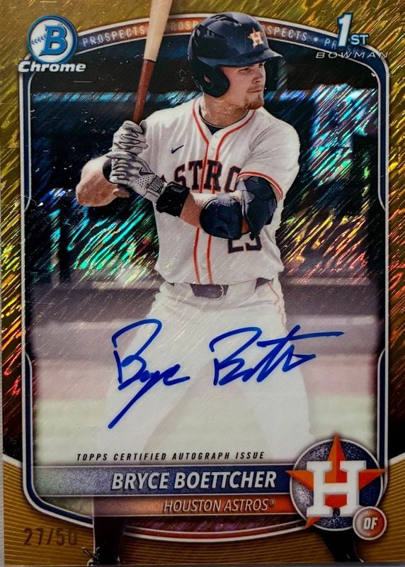 Bryce Boettcher's Baseball cards are available in at least 2 sets. Bryce Boettcher's biggest 7-day price movers are 2025 Bowman Chrome #CPA-BB Prospect Auto - Refractor /499 (1st), 2025 Bowman Chrome #CPA-BB Prospect Auto - Gold Shimmer Refractor /50 (1st), and 2025 Bowman Chrome #CPA-BB Prospect Auto - Orange Shimmer Refractor /25 (1st).