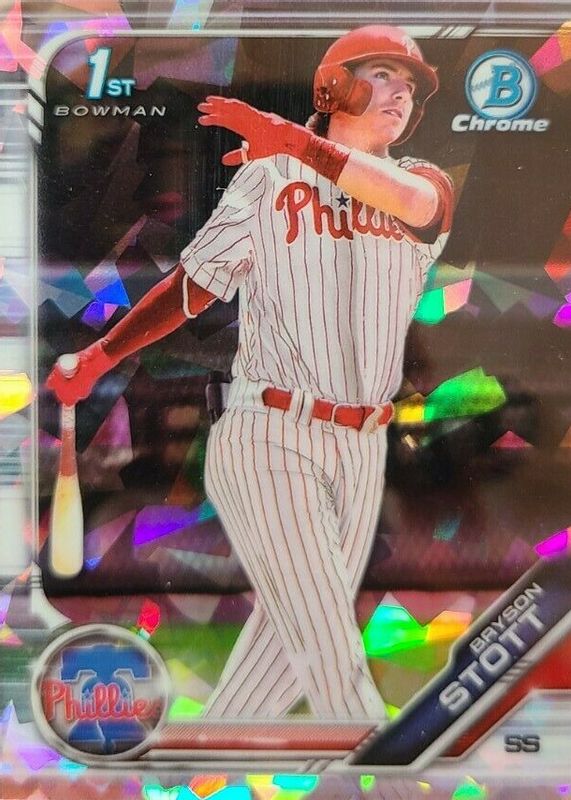 Bryson Stott's Baseball cards are available in at least 51 sets. Bryson Stott's biggest 7-day price movers are 2019 Bowman Draft Sapphire Edition #BDC-79 Chrome, 2019 Bowman Draft #BDC-79 Chrome - Refractor, and 2019 Bowman Draft #CDA-BS Chrome DP Auto - Refractor /499 (1st).