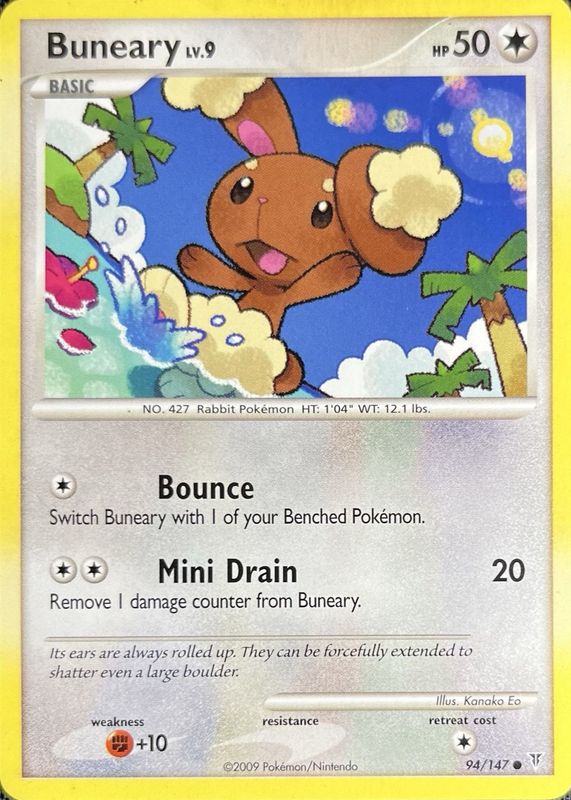 Buneary's Pokemon cards are available in at least 16 sets. Buneary's biggest 7-day price movers are 2008 Diamond & Pearl: Majestic Dawn #053/100 Reverse Holo, 2025 Scarlet & Violet: Prismatic Evolutions #083/131 Master Ball Reverse Holo, and 2009 Platinum: Supreme Victors #094/147 Base.