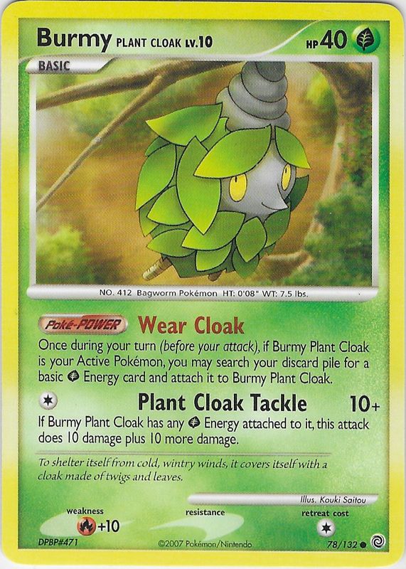 Burmy Plant Cloak's Pokemon cards are available in at least 4 sets. Burmy Plant Cloak's biggest 7-day price movers are 2007 Diamond & Pearl: Secret Wonders #078/132 Base, 2007 Diamond & Pearl: Secret Wonders #078/132 Reverse Holo, and 2009 Platinum: Arceus #56/99 Base.