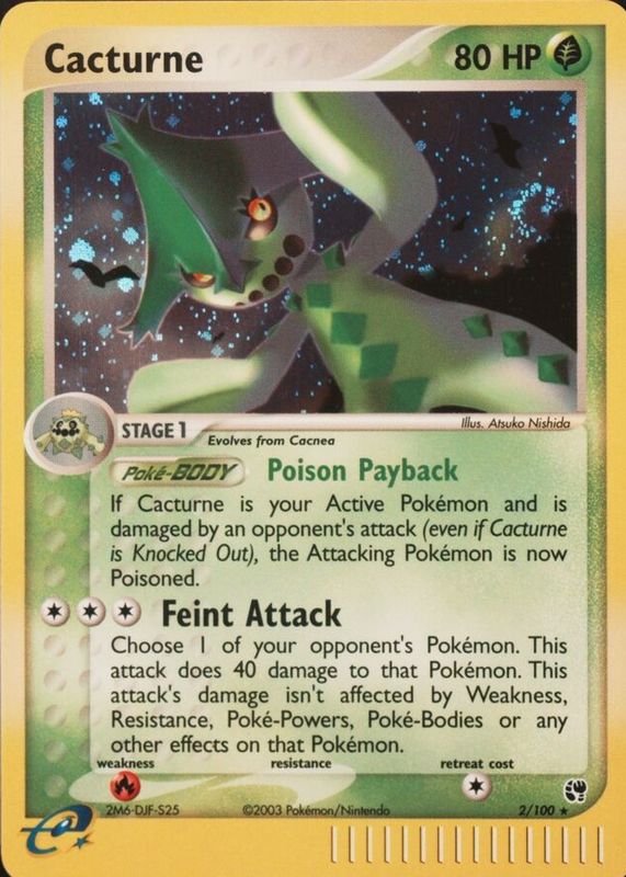 Cacturne's Pokemon cards are available in at least 14 sets. Cacturne's biggest 7-day price movers are 2003 EX: Sandstorm #002/100 Holo, 2003 EX: Sandstorm #002/100 Reverse Holo, and 2015 Japanese XY: Blue Shock #034/059 1st Edition.