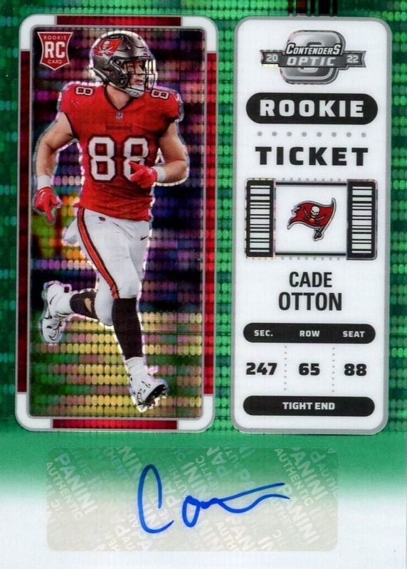 Cade Otton's Football cards are available in at least 7 sets. Cade Otton's biggest 7-day price movers are 2022 Contenders Optic #148 Rookie Ticket Auto - Green Pulsar /30, 2022 Mosaic #361 Blue Fluorescent /15, and 2022 Prizm #362 Rookie Autographs - Purple Power /49.