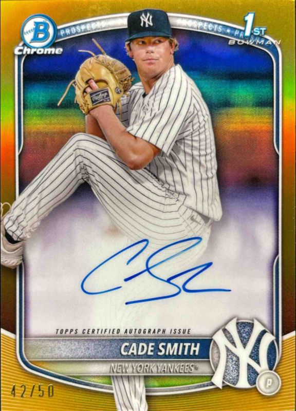 Cade Smith's Baseball cards are available in at least 4 sets. Cade Smith's biggest 7-day price movers are 2025 Bowman Chrome #CPA-CS Prospect Auto - Gold Refractor /50 (1st), 2025 Bowman Chrome #CPA-CS Prospect Auto - Reptilian Blue Refractor /150 (1st), and 2025 Topps Heritage #307 Chrome - Red Refractor /5.