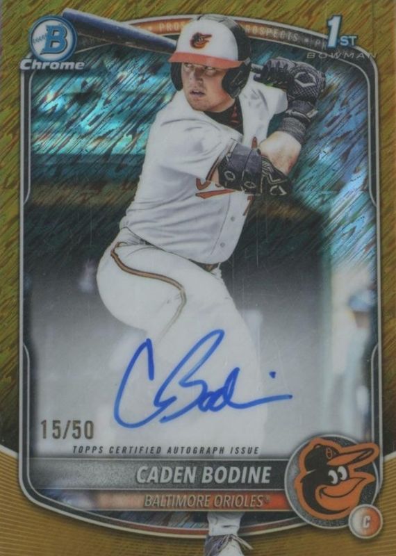 Caden Bodine's Baseball cards are available in at least 5 sets. Caden Bodine's biggest 7-day price movers are 2025 Bowman Draft #CPA-CB Chrome Prospect Auto (1st), 2025 Bowman Draft #CPA-CB Chrome Prospect Auto - Gold Shimmer Refractor /50 (1st), and 2025 Leaf Metal #BA-CB1 Base Autographs - Prismatic Galaxy /1.