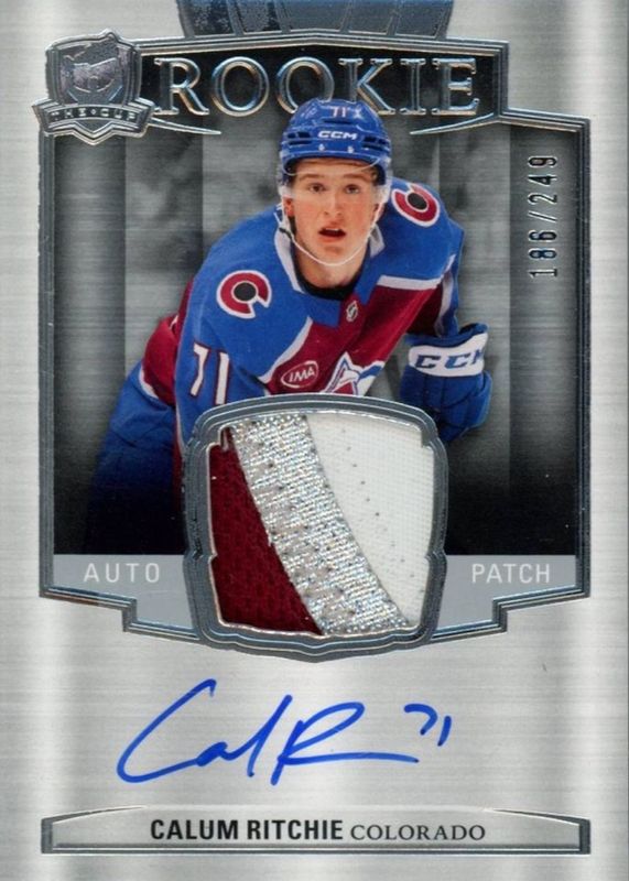 Calum Ritchie's Hockey cards are available in at least 15 sets. Calum Ritchie's biggest 7-day price movers are 2024 Upper Deck The Cup #194 Rookie Patch Auto (/249), 2024 Upper Deck #477 Young Guns - Clear Cut, and 2021 Upper Deck CHL #378 Autographs.