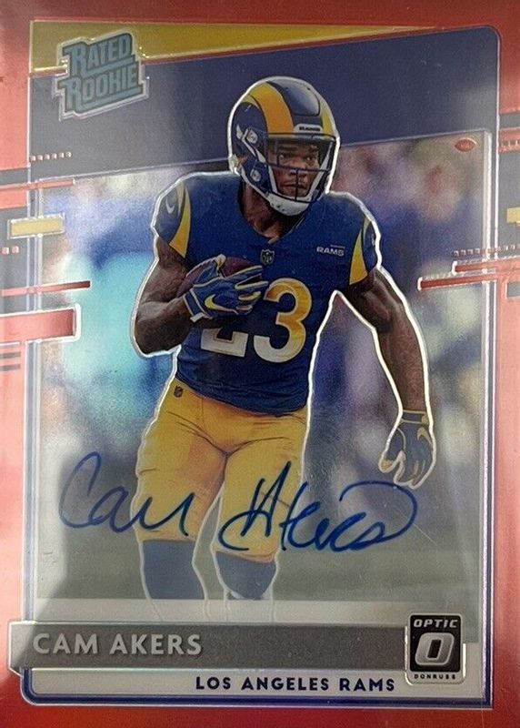 Cam Akers' Football cards are available in at least 32 sets. Cam Akers' biggest 7-day price movers are 2020 Optic #175 Rated Rookie Autographs - Red /50, 2020 Select #155 Premier Level Neon Green /49, and 2020 Obsidian #RJI-21 Rookie Jersey Ink - Electric Etch Purple (/40).