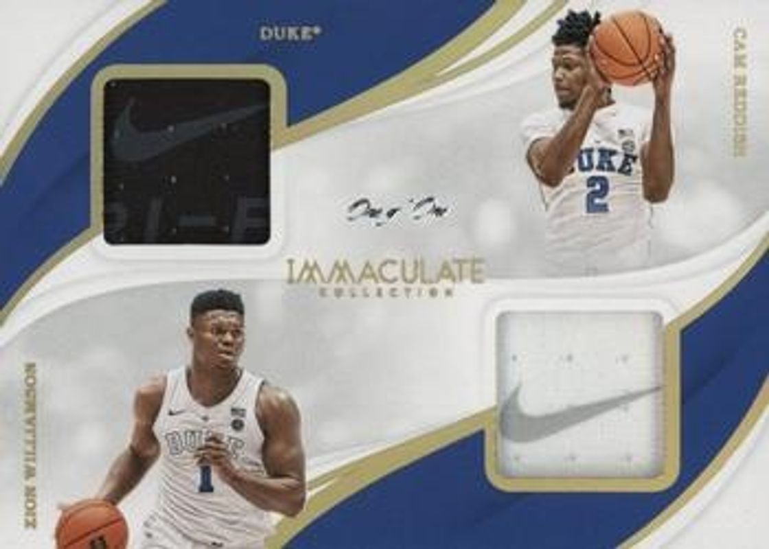 Cam Reddish / Zion Williamson's Basketball cards are available in at least 4 sets. Cam Reddish / Zion Williamson's biggest 7-day price movers are 2019 Immaculate Collegiate #5 Combos Relics - Tags /1, 2019 Immaculate Collegiate #5 Combos Relics - Prime /5, and 2019 Immaculate Collegiate #5 Combos Relics /10.