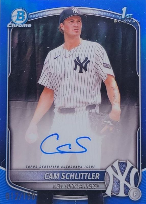 Cam Schlittler's Baseball cards are available in at least 8 sets. Cam Schlittler's biggest 7-day price movers are 2026 Topps #111 Aqua Rainbow Foil, 2025 Bowman Chrome #BCP-166 Prospects - Shimmer Refractor (1st), and 2026 Topps #111 Sandglitter.
