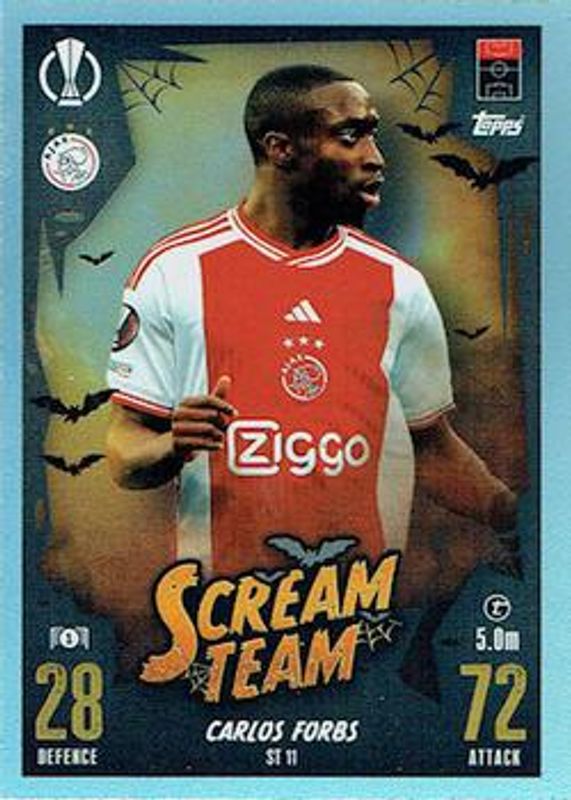 The biggest 30-day change Carlos Forbs cards are 2023 Topps Match Attax UEFA Club Competitions #ST-11 Scream Team, 2023 Topps Match Attax UEFA Club Competitions Extra #227 Emerald, and 2023 Topps Match Attax UEFA Club Competitions Extra #227 Base.
