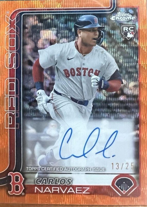 Carlos Narvaez's Baseball cards are available in at least 14 sets. Carlos Narvaez's biggest 7-day price movers are 2025 Topps Chrome #RA-CAN Rookie Autographs - Orange Wave Refractor /25, 2025 Topps Update #90B2-CN 1990 Topps Autographs - Gold Foil /50, and 2025 Topps Update #90B2-CN 1990 Topps Autographs.