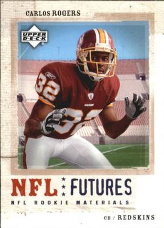 Carlos Rogers' Football cards are available in at least 17 sets. Carlos Rogers' biggest 7-day price movers are 2005 Upper Deck Rookie Materials #122 Base, 2005 Topps Heritage #THC18b Foil, and 2005 Topps Heritage #62a Base.