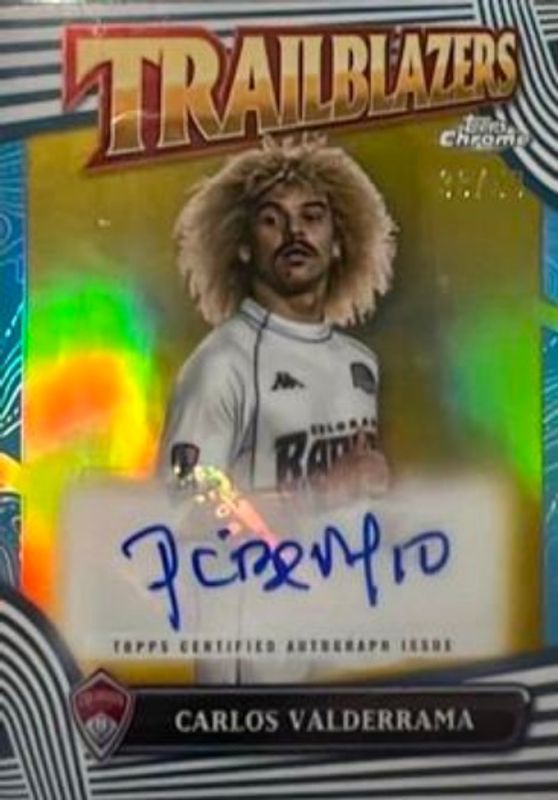 The biggest 30-day change Carlos Valderrama cards are 2024 Topps Chrome MLS #TA-CV MLS Trailblazers Autographs - Gold Refractor /50, 2024 Topps Chrome MLS #104 Black Wave Refractor /10, and 2024 Topps Chrome MLS #104 Blue Wave Refractor /150.