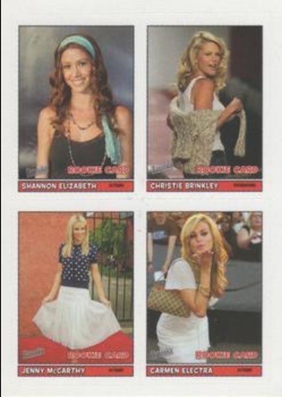 Carmen Electra / Christie Brinkley / Jenny McCarthy / Shannon Elizabeth's Basketball cards are available in at least 2 sets. Carmen Electra / Christie Brinkley / Jenny McCarthy / Shannon Elizabeth's biggest 7-day price movers are 2005 Bazooka #33 4 on 1 Stickers, 2005 Topps Luxury Box #BOR-31 Box Out Quad Relics /193, and 2005 Topps Luxury Box #BOR-31 Box Out Quad Relics - Courtside /25.