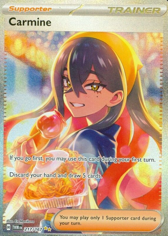 Carmine's Pokemon cards are available in at least 4 sets. Carmine's biggest 7-day price movers are 2025 Scarlet & Violet: Prismatic Evolutions #103/131 Poke Ball Reverse Holo, 2024 Scarlet & Violet: Twilight Masquerade #204/167 Ultra Rare, and 2024 Japanese Scarlet & Violet: Transformation Mask #123/101 Super Rare.
