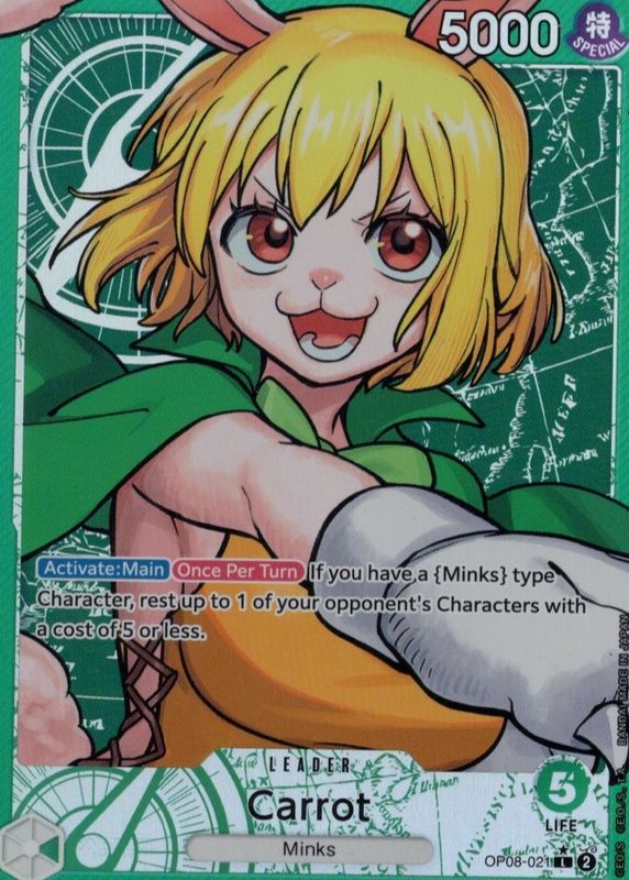 Carrot's One Piece cards are available in at least 2 sets. Carrot's biggest 7-day price movers are 2024 Two Legends #OP08-021 Leader (Alternate Art), 2024 Two Legends #OP08-021 Leader, and 2024 Two Legends #OP08-023 Super Rare.