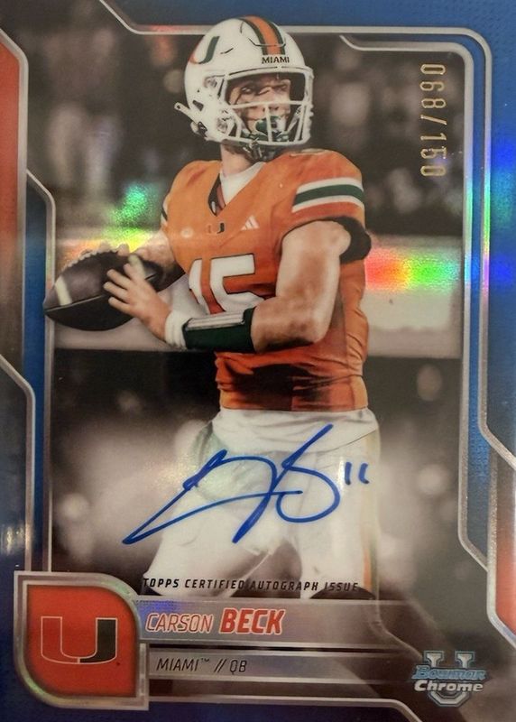 Carson Beck's Football cards are available in at least 25 sets. Carson Beck's biggest 7-day price movers are 2024 Prizm Draft Picks #130 Red Ice, 2025 Bowman Chrome University #BCA-CBE Prospect Auto - Blue Refractor /150, and 2025 Bowman Chrome University #BCA-CBE Prospect Auto.