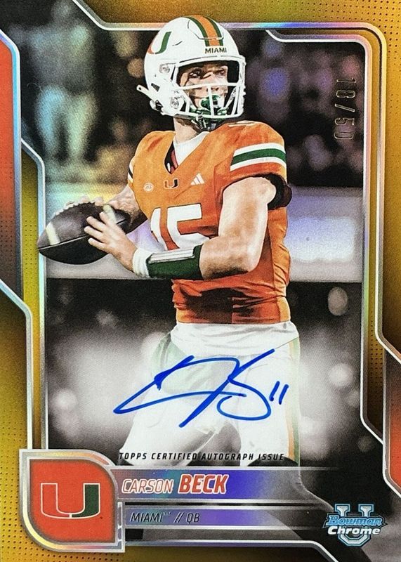 Carson Beck's Football cards are available in at least 26 sets. Carson Beck's biggest 7-day price movers are 2025 Bowman U Now #5 Base (Print Run: 3,630), 2023 Bowman Chrome University Sapphire Edition #44 Base (1st), and 2025 Bowman Chrome University #BCA-CBE Prospect Auto - Gold Refractor /50.