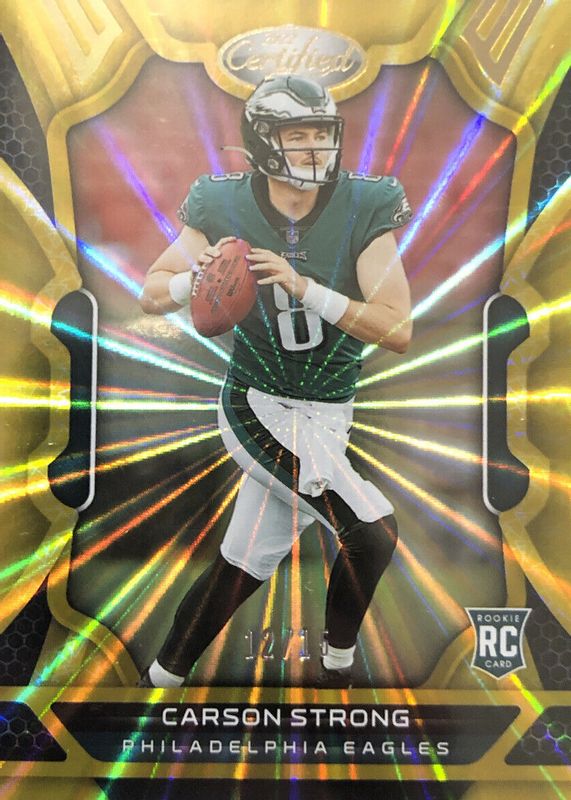 Carson Strong's Football cards are available in at least 5 sets. Carson Strong's biggest 7-day price movers are 2022 Certified #104 FOTL Mirror Gold /15, 2022 Prestige #SA-6 State of the Art /(SSP), and 2022 Certified #104 Mirror /325.