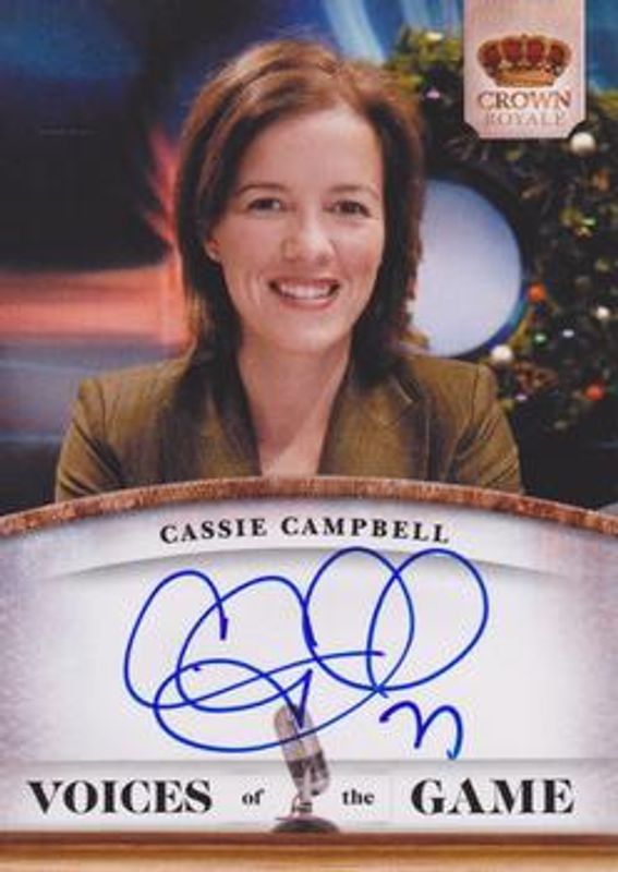 Cassie Campbell's Hockey cards are available in at least 4 sets. Cassie Campbell's biggest 7-day price movers are 2010 Crown Royale #11 Voices Of The Game Signatures, 2015 In The Game Final Vault #A-C 2006 In The Game Going For Gold Canadian Women's National Team Autographs (Black Vault Stamp), and 2015 In The Game Final Vault #GUJ-65 2007 In The Game O Canada Game Used Jersey (Gold Vault Stamp) /1.