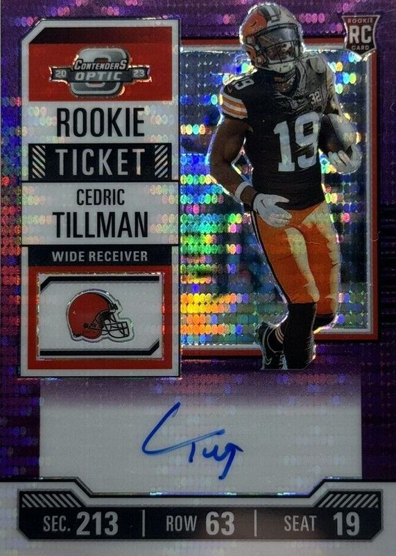 Cedric Tillman's Football cards are available in at least 12 sets. Cedric Tillman's biggest 7-day price movers are 2023 Contenders Optic #104 Rookie Ticket Auto - Purple Pulsar /21, 2023 Prizm #321 Rookie Autographs - Green Scope /75, and 2023 Contenders Optic #104 Rookie Ticket Auto Variation - Gold Vinyl /1.