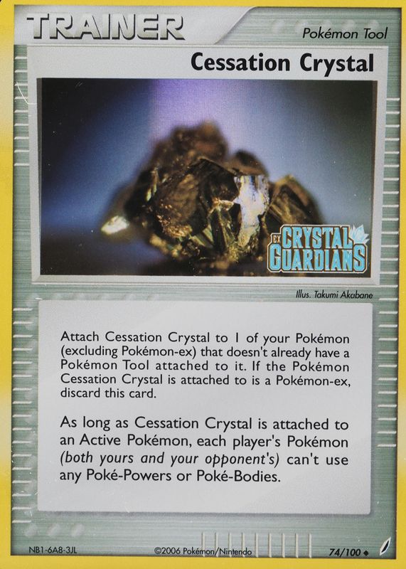 Cessation Crystal's Pokemon cards are available in at least 2 sets. Cessation Crystal's biggest 7-day price movers are 2006 EX: Crystal Guardians #074/100 Reverse Holo, 2006 EX: Crystal Guardians #074/100 Base, and 2006 Japanese EX: Miracle Crystal #072/075 1st Edition.