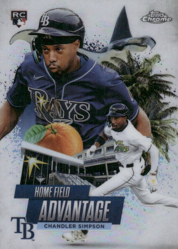 Chandler Simpson's Baseball cards are available in at least 17 sets. Chandler Simpson's biggest 7-day price movers are 2025 Topps Chrome Update #HA-50 Home Field Advantage /(SSP), 2025 Topps Chrome Update #USC179 Prism Refractor, and 2025 Topps Update #US349 Rookie Debut - Gold /2025.