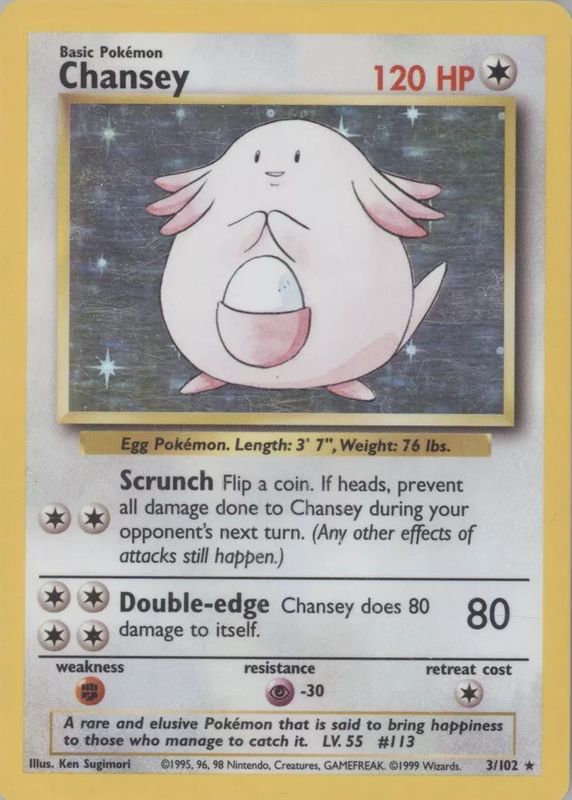 Chansey's Pokemon cards are available in at least 30 sets. Chansey's biggest 7-day price movers are 2023 Japanese Scarlet & Violet: 151 #113/165 Master Ball Reverse Holo, 2002 Expedition #072/165 Base, and 1999 Pokemon Game #3 Unlimited Holo.