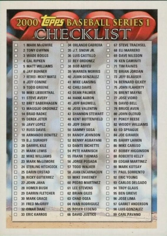 Checklist's Baseball cards are available in at least 83 sets. Checklist's biggest 7-day price movers are 2000 Topps #1 Checklists Series 1 - Red, 2000 Topps #2 Checklists Series 1 - Red, and 2000 Topps #1 Checklists Series 2 Yellow (Retail).
