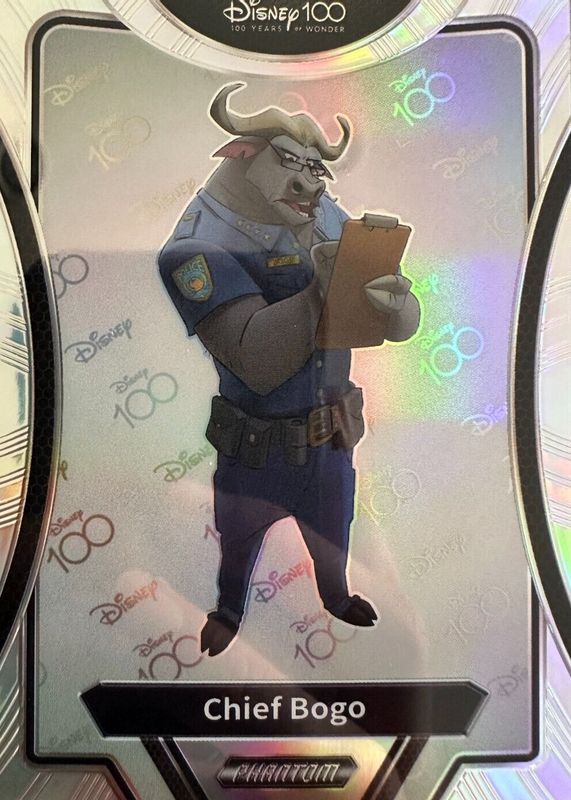 Chief Bogo's Disney cards are available in at least 5 sets. Chief Bogo's biggest 7-day price movers are 2023 Kakawow Phantom Disney 100 Years of Wonder #PD-I 50 Silver /(Est. Print Run 1,200), 2025 Topps Chrome Disney #ZI-2 Zootopia Icons - Orange Refractor /25, and 2025 Topps Chrome Disney #ZI-2 Zootopia Icons.
