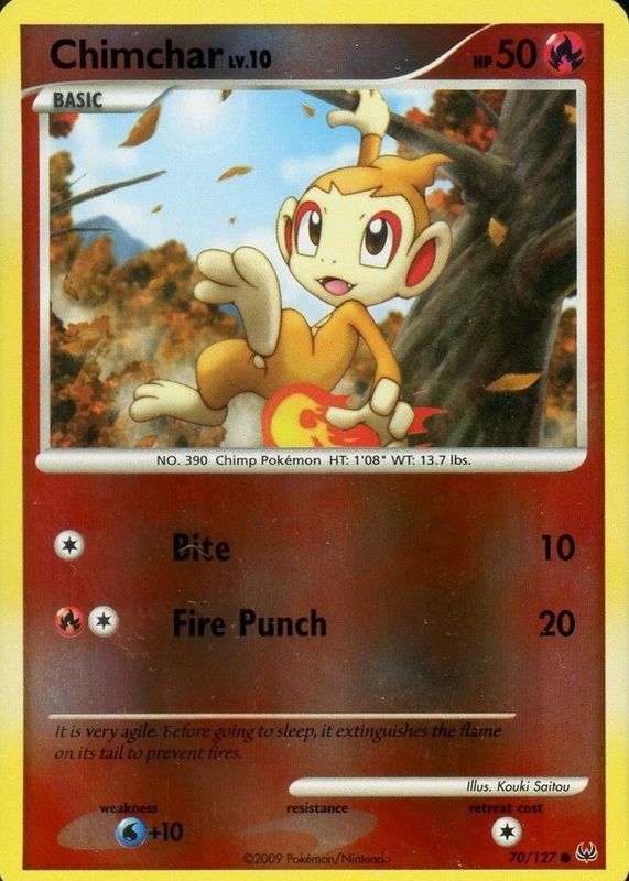 Chimchar's Pokemon cards are available in at least 12 sets. Chimchar's biggest 7-day price movers are 2009 Platinum #070/127 Reverse Holo, 2016 Japanese XY: Cruel Traitor #011/054 1st Edition, and 2007 Diamond & Pearl: Black Star Promo #DP02 Three Pack Blisters.