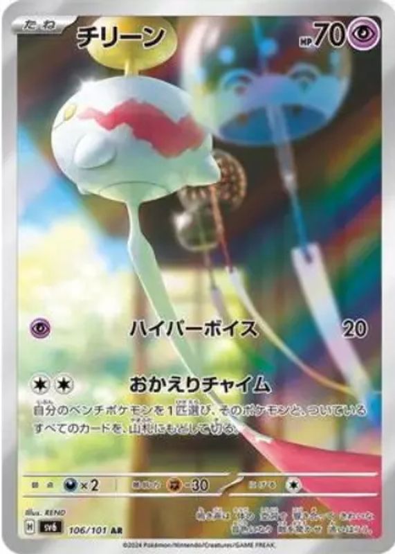 Chimecho's Pokemon cards are available in at least 13 sets. Chimecho's biggest 7-day price movers are 2024 Scarlet & Violet: Twilight Masquerade #179/167 Illustration Rare, 2024 Japanese Scarlet & Violet: Transformation Mask #106/101 Art Rare, and 2004 EX: Hidden Legends #017/101 Reverse Holo.