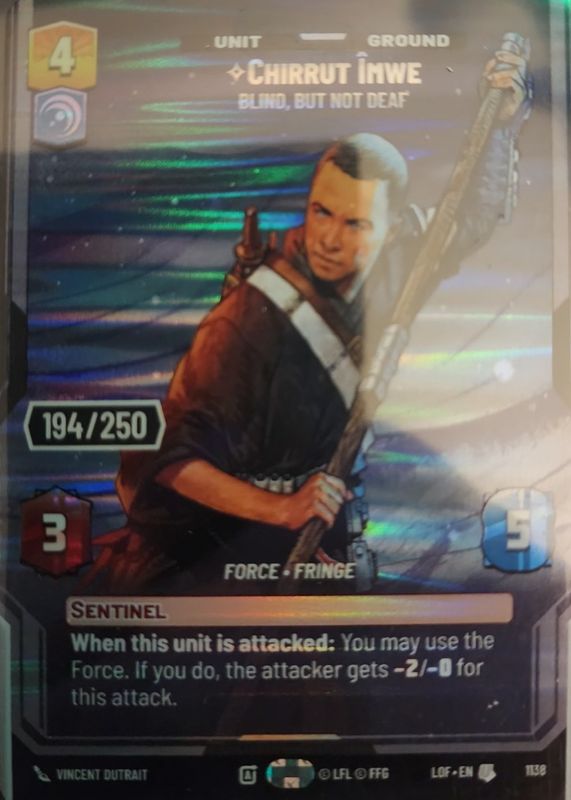 Chirrut Imwe - Blind, but not Deaf's Star Wars Unlimited cards are available in at least 1 sets. Chirrut Imwe - Blind, but not Deaf's biggest 7-day price movers are 2025 Legends of the Force #1138 Prestige Serialized /250, 2025 Legends of the Force #1092 Prestige Foil, and 2025 Legends of the Force #1046 Prestige.