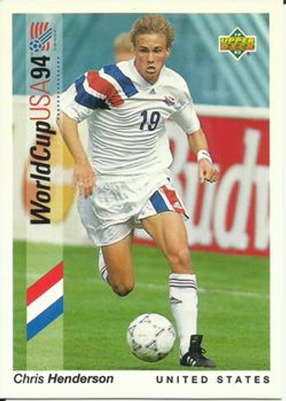 Chris Henderson's Soccer cards are available in at least 6 sets. Chris Henderson's biggest 7-day price movers are 1993 Upper Deck World Cup Preview (English/Spanish) #WC-P3 Promos, 1993 Upper Deck World Cup Preview (English/Spanish) #19 USA Autographed Factory, and 1993 Upper Deck World Cup Preview (English/Spanish) #19 Base.