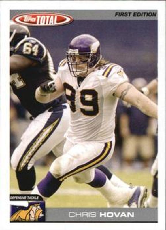 Chris Hovan's Football cards are available in at least 3 sets. Chris Hovan's biggest 7-day price movers are 2004 Topps Total #41 First Edition, 2004 Topps Total #41 Silver, and 2004 Topps Total #41 Base.