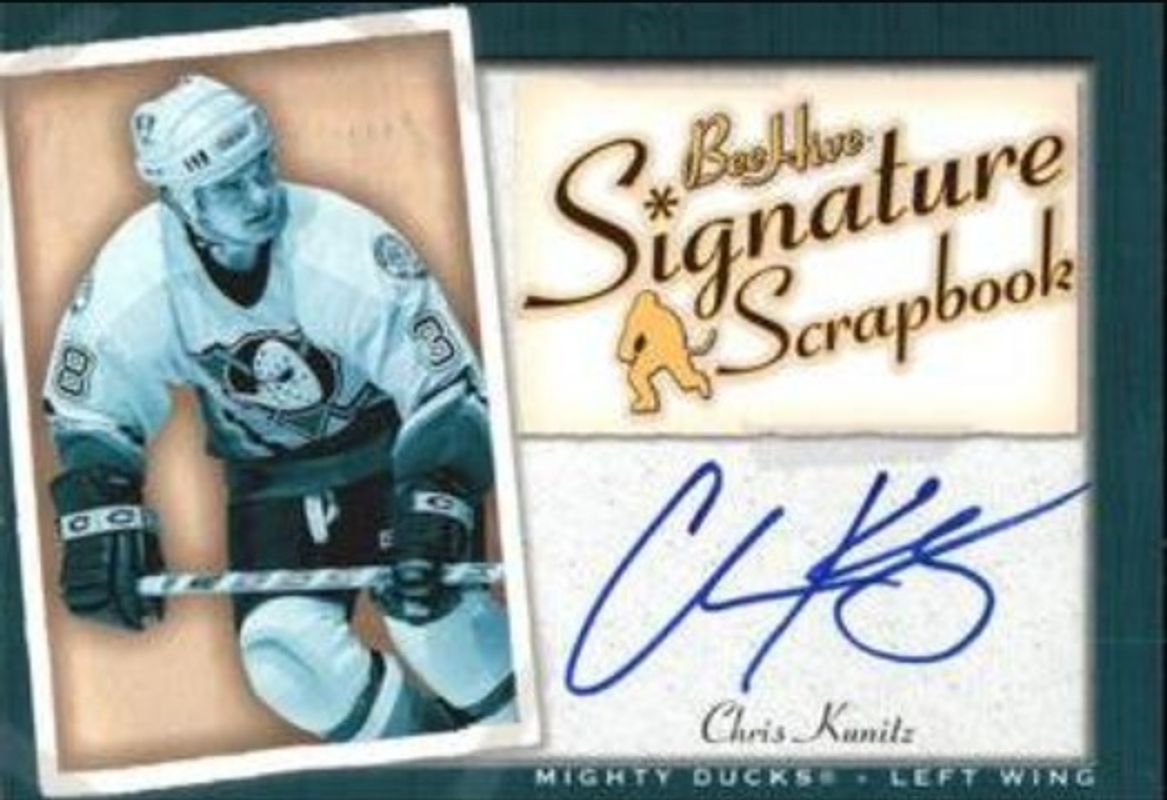 Chris Kunitz's Hockey cards are available in at least 89 sets. Chris Kunitz's biggest 7-day price movers are 2005 Upper Deck Beehive #SS-CK Signatures Scrapbook, 2006 Upper Deck Be a Player #CK BAP Signatures, and 2006 Upper Deck Be a Player #108 BAP Signatures SN25 /25.