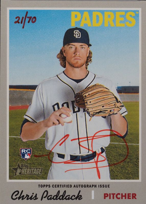 Chris Paddack's Baseball cards are available in at least 29 sets. Chris Paddack's biggest 7-day price movers are 2019 Topps Heritage High Number #ROA-CP Real One Autographs - Red Ink /70, 2017 Bowman Chrome #CPA-CP Prospect Auto - Blue Mojo Refractor /150 (1st), and 2017 Bowman Chrome #CPA-CP Prospect Auto - Blue Refractor /150 (1st).
