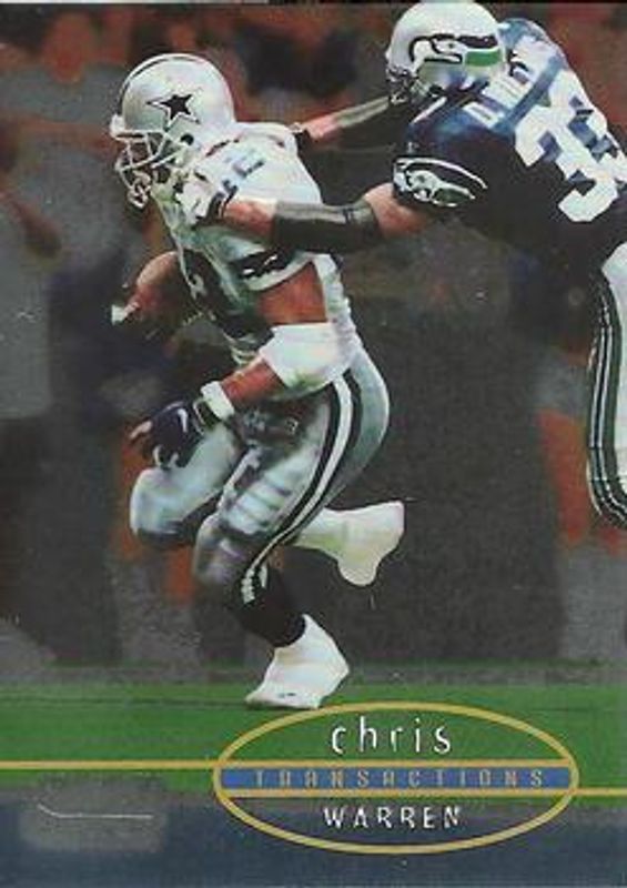 Chris Warren's Football cards are available in at least 72 sets. Chris Warren's biggest 7-day price movers are 1998 Topps Stadium Club #22 Base, 1998 Topps Stadium Club #22 Printing Plates Magenta, and 1998 Topps Stadium Club #22 First Day Issue /200.