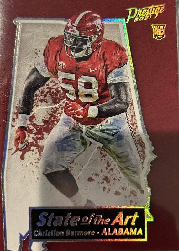 The biggest 30-day change Christian Barmore cards are 2021 Prizm #388 Silver, 2021 Immaculate #160 Rookie Autographs - Gold /25, and 2021 Prestige #14 State of the Art /(SSP).