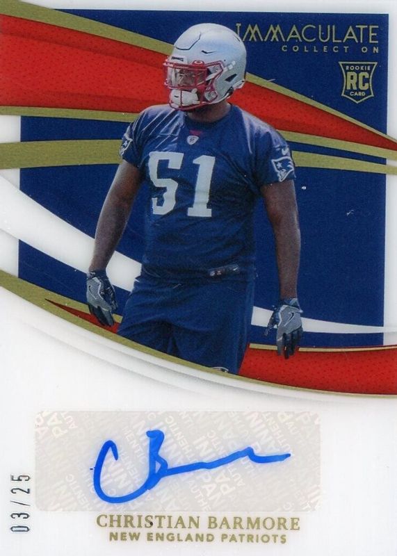 Christian Barmore's Football cards are available in at least 3 sets. Christian Barmore's biggest 7-day price movers are 2021 Prizm #388 Silver, 2021 Immaculate #160 Rookie Autographs - Gold /25, and 2021 Prestige #14 State of the Art /(SSP).