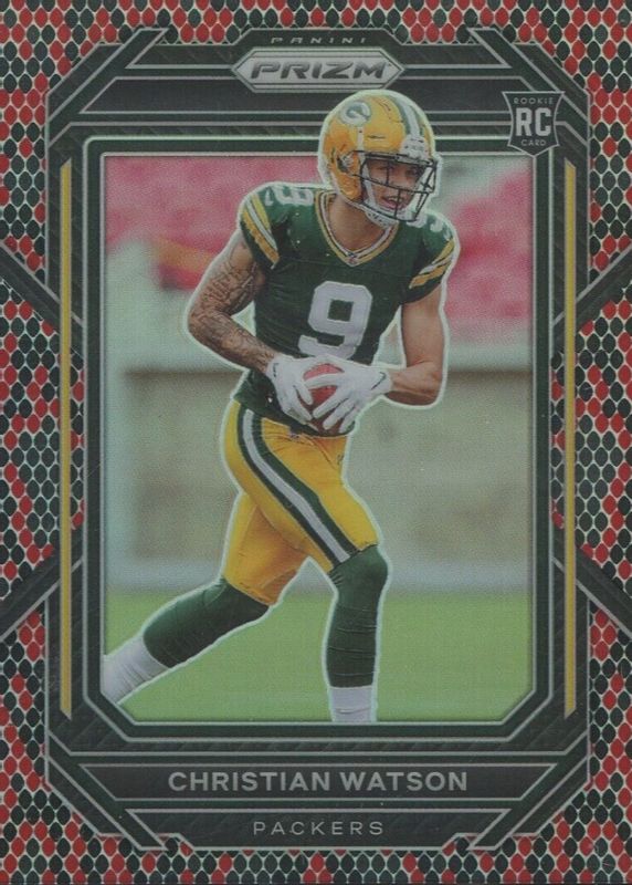 Christian Watson's Football cards are available in at least 39 sets. Christian Watson's biggest 7-day price movers are 2022 Prizm #314 Snakeskin /(SSP), 2022 Chronicles #CRS-CHW Crown Royale Silhouette Autographs (/99), and 2022 Donruss #319 Rated Rookie Portrait Autographs /49.