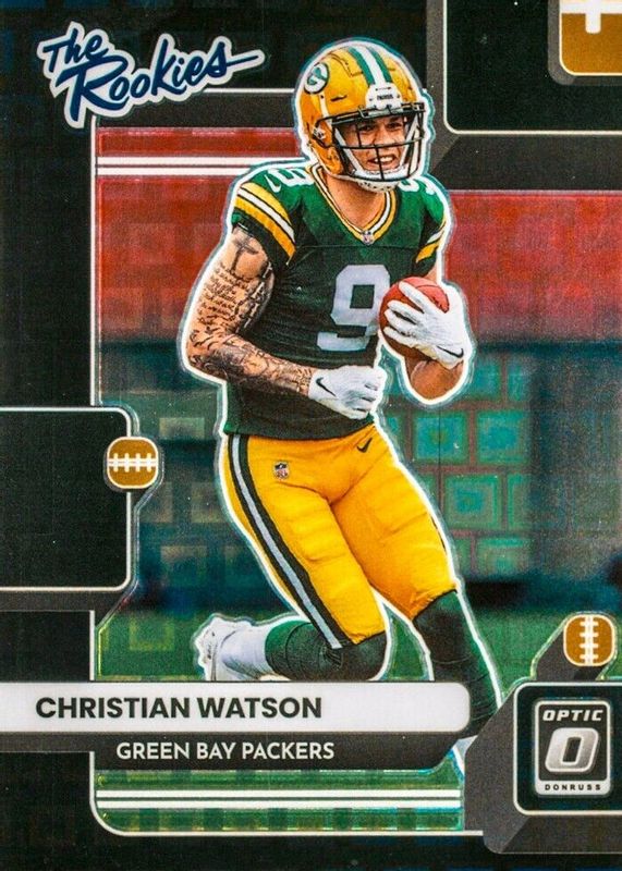 Christian Watson's Football cards are available in at least 33 sets. Christian Watson's biggest 7-day price movers are 2022 Select #SS-19 Snapshots - Silver, 2022 Prizm #314 Variation, and 2022 Optic #TR-15 The Rookies - Black Pandora /25.