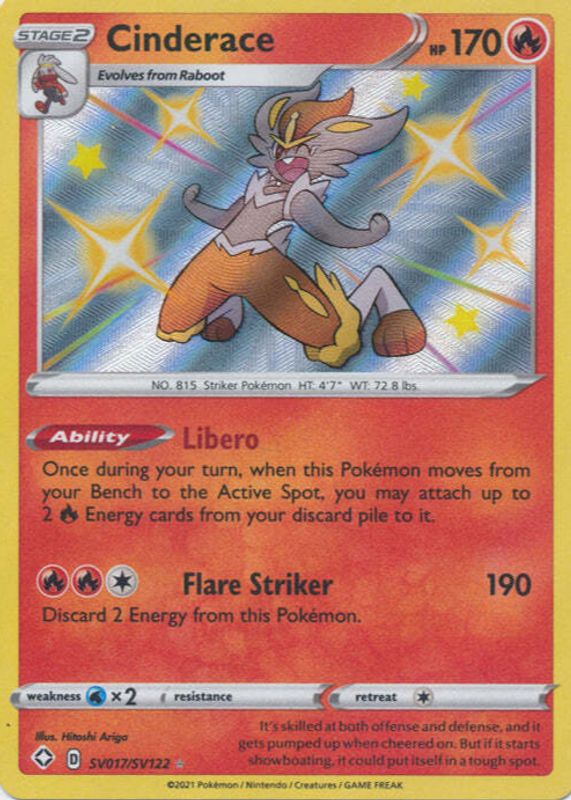Cinderace's Pokemon cards are available in at least 4 sets. Cinderace's biggest 7-day price movers are 2021 Sword & Shield: Shining Fates #SV017 Shiny Rare, 2025 Japanese Mega Brave #17/63 Holo, and 2025 Mega Evolution #028/132 Reverse Holo.