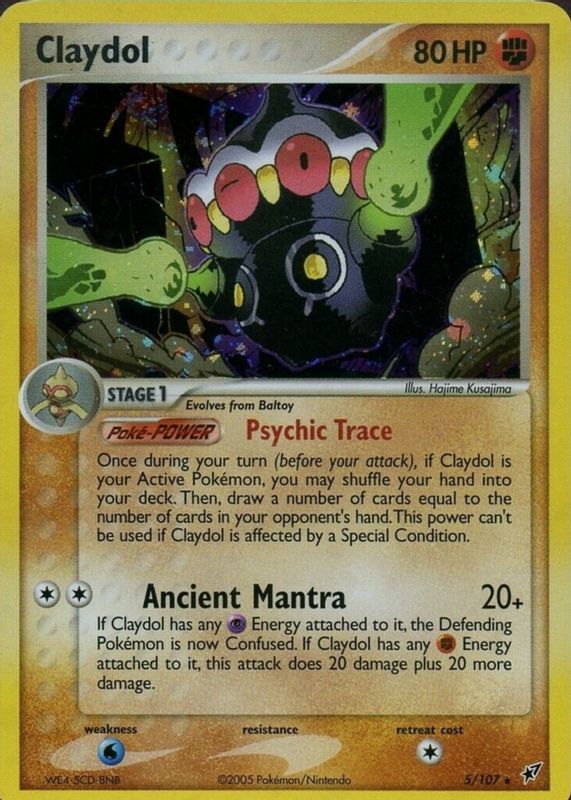 Claydol's Pokemon cards are available in at least 20 sets. Claydol's biggest 7-day price movers are 2005 EX: Deoxys #005/107 Holo, 2005 EX: Deoxys #005/107 Reverse Holo, and 2004 Japanese EX: Undone Seal #045/083 1st Edition Holo.