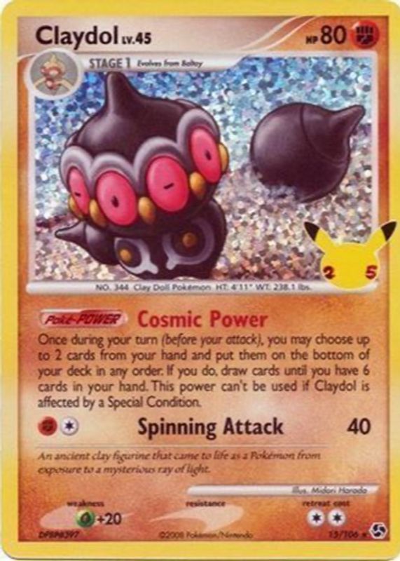 Claydol's Pokemon cards are available in at least 18 sets. Claydol's biggest 7-day price movers are 2006 EX: Holon Phantoms #038/110 Base, 2004 Japanese EX: Undone Seal #045/083 1st Edition Holo, and 2004 Japanese EX: Clash of the Blue Sky #054/082 1st Edition Holo.
