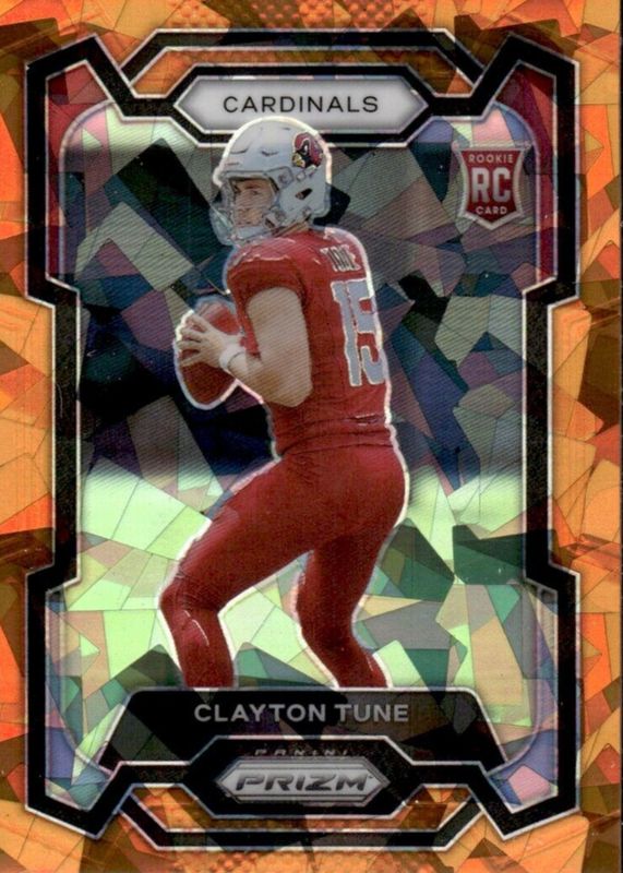 Clayton Tune's Football cards are available in at least 16 sets. Clayton Tune's biggest 7-day price movers are 2023 Prizm #302 Orange Ice, 2023 Select #402 Suite Level Black /1, and 2023 Mosaic #302 Pink Camo.