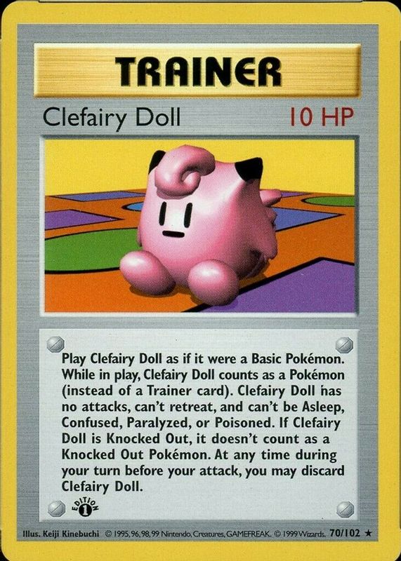 Clefairy Doll's Pokemon cards are available in at least 2 sets. Clefairy Doll's biggest 7-day price movers are 1999 Pokemon Game #70 1st Edition, 1999 Pokemon Game #70 Unlimited, and 1999 Pokemon Game #70 Shadowless.