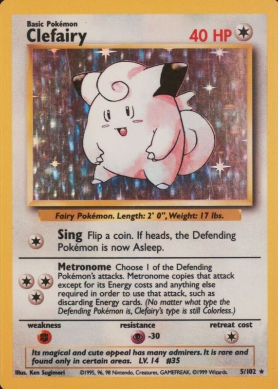 Clefairy's Pokemon cards are available in at least 33 sets. Clefairy's biggest 7-day price movers are 2023 Scarlet & Violet: 151 #035/165 Base, 2019 Sun & Moon: Hidden Fates #39/68 Reverse Holo, and 2000 Base Set 2 #6/130 Holo.