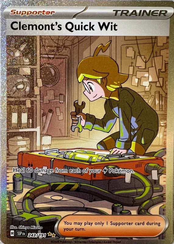 Clemont's Quick Wit's Pokemon cards are available in at least 2 sets. Clemont's Quick Wit's biggest 7-day price movers are 2024 Japanese Scarlet & Violet: Super Electric Breaker #128/106 Super Rare (Full Art), 2024 Scarlet & Violet: Surging Sparks #167/191 Reverse Holo, and 2024 Japanese Scarlet & Violet: Super Electric Breaker #103/106 Base.